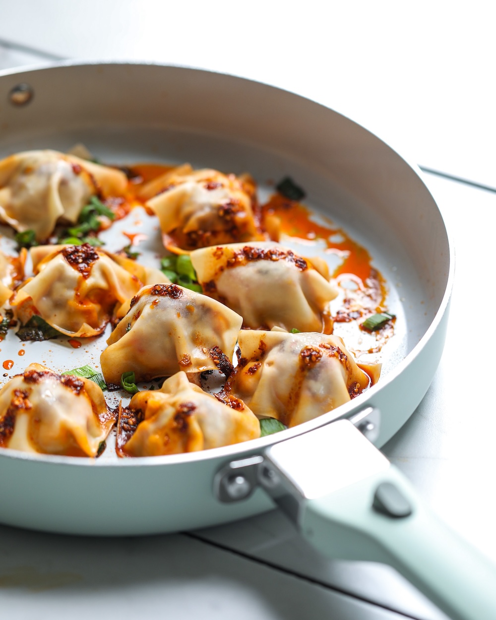 - Add a teaspoon of chili crunch on top of each scoop. Cover with wonton wrappers and cover the skillet with a lid to steam and cook.