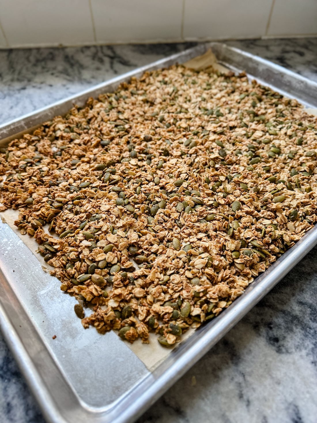 • Remove from the oven and allow the granola to cool completely (about 30 minutes). Once cooled, transfer to an airtight container for storage.