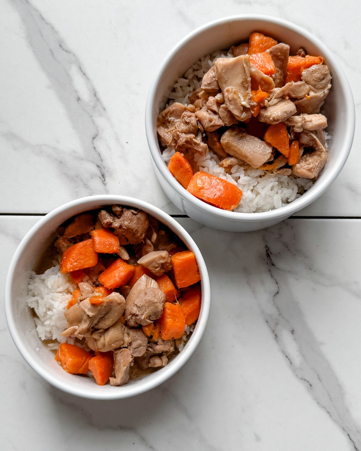 - Serve warm over cooked white rice or cauliflower rice and garnish with cilantro or green onion.