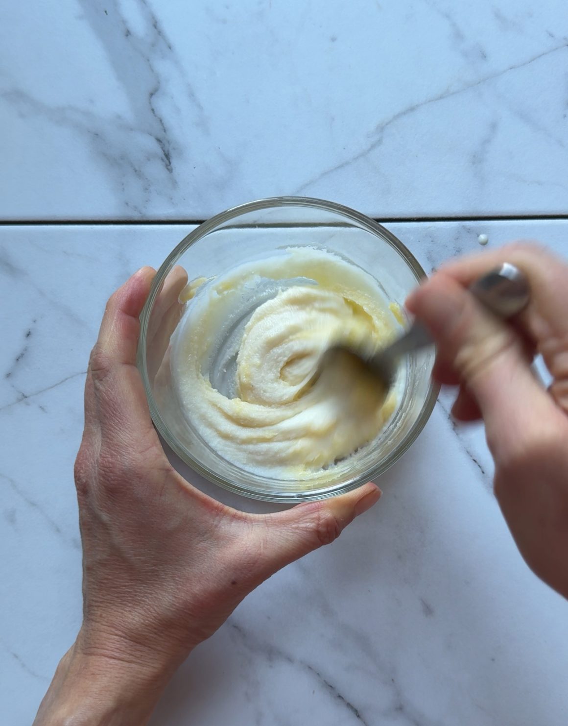 Step 1: Whisk the coconut butter and ghee together until creamy. I used 1/4 cup softened coconut butter and 1 tablespoon of ghee, room temperature.